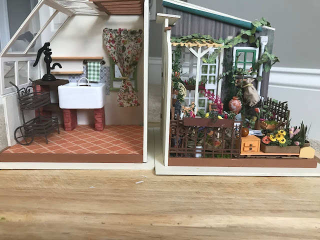 Another element of the rooftop garden arrived and I've completed the basic Robotime Jason's Kitchen room. It's another 1:24 scale DIY kit, however, I wanted this one to be truer to a 1:12 scale and so I only constructed the portions that lend to that idea. There's a hutch I plan to use on the spare wall that I will fill with various gardening items, but it is currently with the Hobbies dollhouse further south, which means, as has been fairly typical during this process, I'll have to wait to complete it. For now, I have a to scale planter, which still needs greenery or flowers to fill its currently empty shelves; as well as a sink with a water pump and bucket.